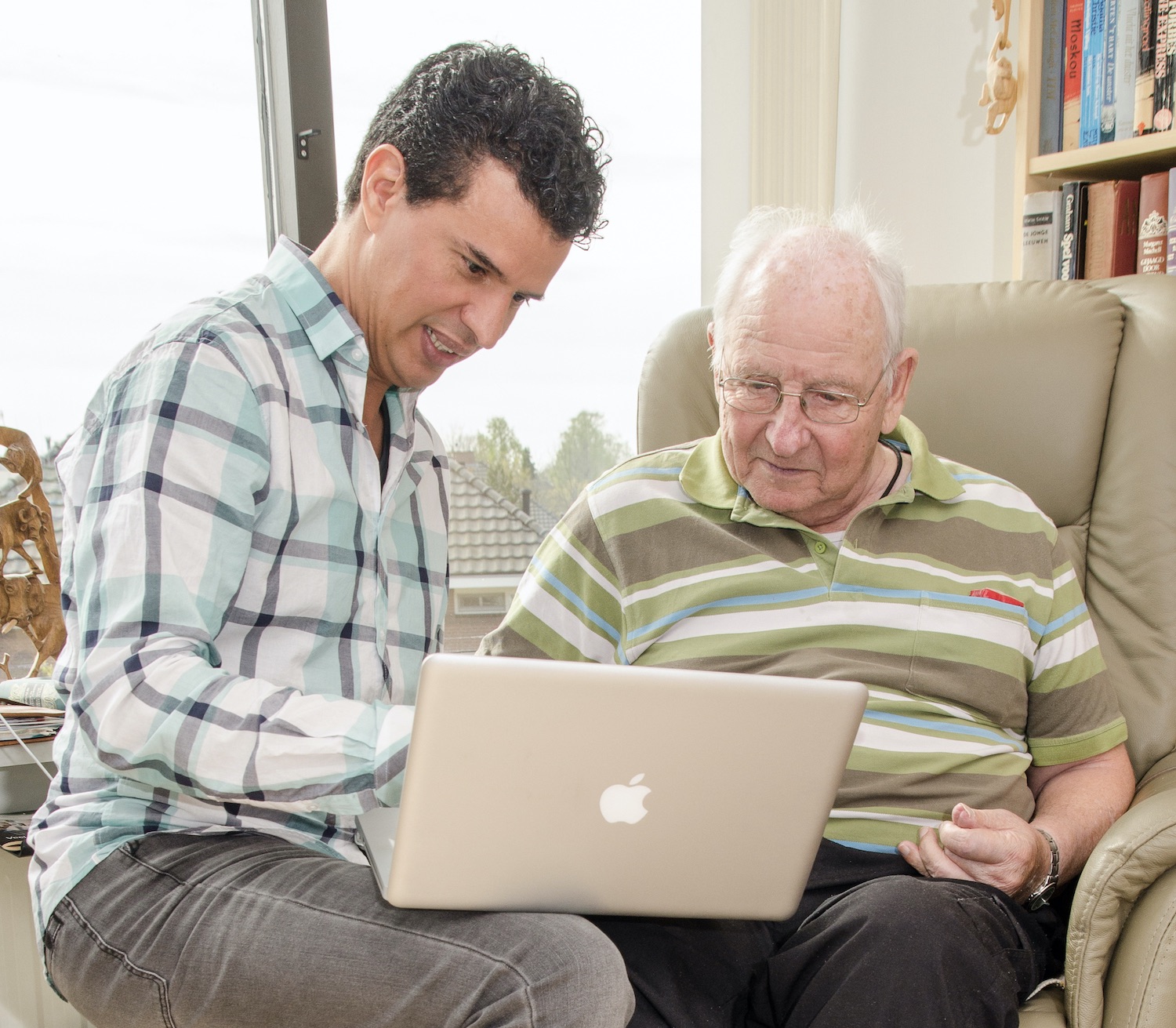 Foto: onderzoeker Ahmed Nait Aicha met een bewoner van revalidatiecentrum Naarderheem.
