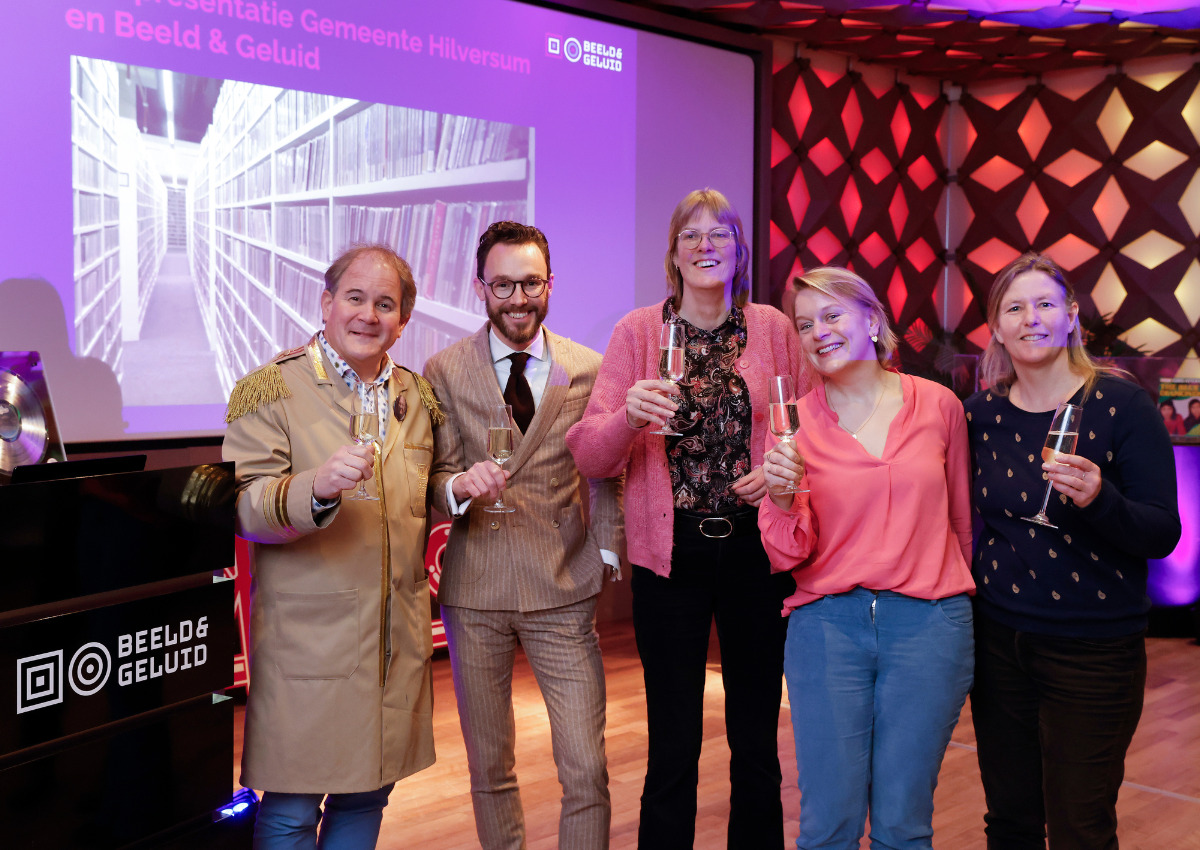 Op de foto v.l.n.r.: Eppo van Nispen tot Sevenaer (directeur Beeld & Geluid), wethouders Arno Scheepers en Karin Walters (gemeente Hilversum), Julia Vytopil (plaatsvervangend directeur Beeld & Geluid) en Corine Lindenbergh (projectleider Beeld & Geluid). Foto: Arvid Kastermans.