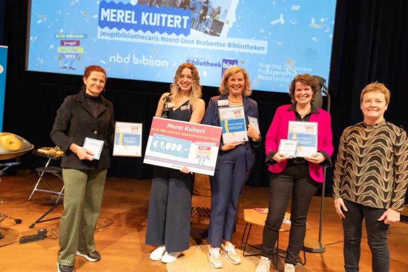 Bij de prijsuitreiking voor de NBD Biblion Jeugdspecialist van het Jaar 2023 was het spannend. Jeugdbibliothecaris Merel Kuitert van bibliotheek Uden wist haar twee collega’s Monique Dijkgraaf (leesconsulent voortgezet onderwijs Bibliotheek Noord-Veluwe) en Astrid Goedknegt (consulent lezen en media Bibliotheek Kennemerwaard) voor te blijven. De jury noemt Kuitert een ‘creatieve krachtpatser’. ‘Ze brengt leesplezier naar jongeren in het voortgezet onderwijs met activiteiten, advies en innovatieve initiatieven. Merel begrijpt jongeren en blijft ze boeien met nieuwe ideeën.’