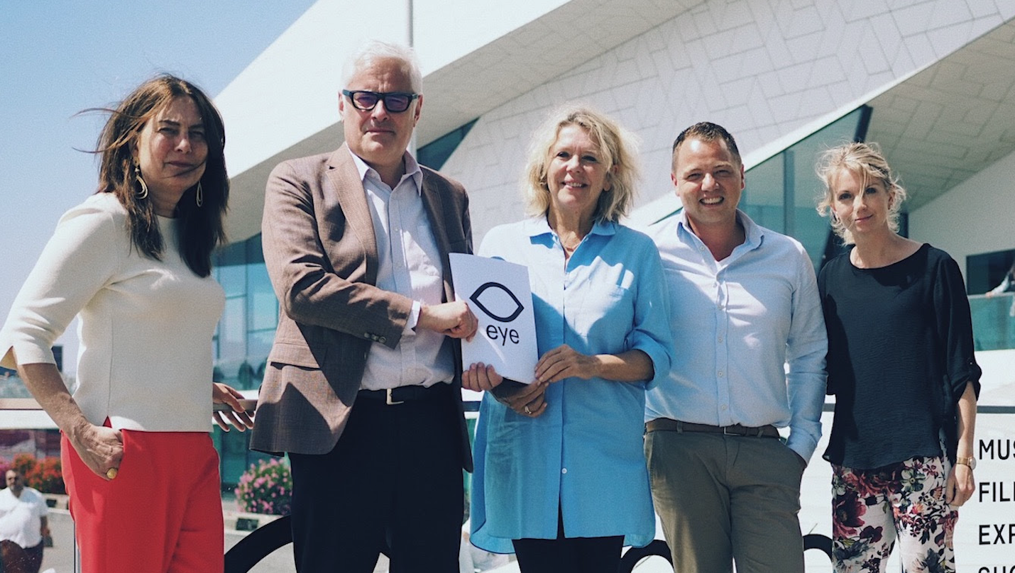 Op de foto: Hester Barkey Wolf (Head of Development, Eye Filmmuseum), Karl Everaert (Country Manager, Panasonic Business), Sandra den Hamer (Directeur, Eye Filmmuseum), Ben Moors (Project Sales Manager Benelux, Panasonic Visual Solutions) en Tamsin Campbell (Corporate Partnerships, Eye Filmmuseum).