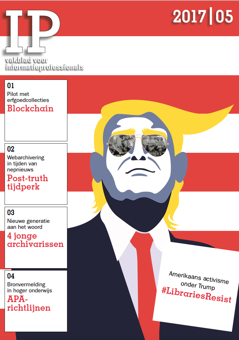 Sinds zijn verkiezing tot president van de Verenigde Staten is Donald Trump dominant aanwezig in de internationale media. Nu prijkt hij ook op de cover van IP. Hij is de eerste politieke leider die die twijfelachtige eer krijgt, en dat is natuurlijk niet voor niets. Waar Obama in acht jaar tijd 277 decreten tekende (35 per jaar), vaardigde Trump er in zijn eerste 100 dagen al 32 uit. Een deel daarvan is zo controversieel dat het leidde tot een nieuwe bloeiperiode van activisme in de VS, ook onder informatieprofessionals. In het artikel ‘Bad-Ass Librarians en Guerilla Archivists’ brengt Marjo Bakker in kaart welke gevaren Amerikaanse bibliothecarissen en archivarissen zagen opdoemen en welke acties zij tot dusver ondernamen in een poging het tij te keren. Dat varieert van het veiligstellen van data die Trump het liefst vernietigd zou zien tot het zich opwerpen als betrouwbaar informatiebaken in de jungle van nepnieuws en alternatieve feiten.