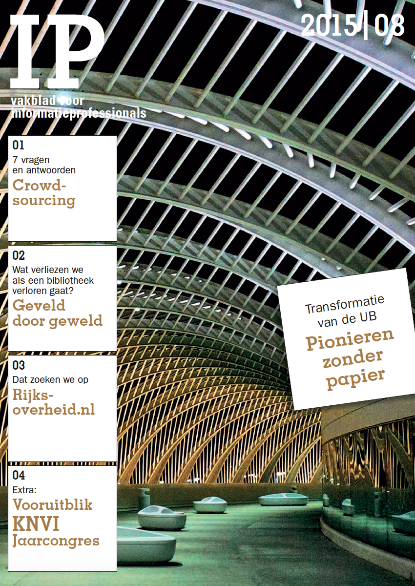Zo vraagt Vincent Janssen zich in het coverartikel af hoe de universiteitsbibliotheek van de toekomst eruitziet. Verder beantwoordt Nicoline van der Sijs 7 veelgestelde vragen over crowdsourcing. En in de bijlage over hét jaarcongres voor informatieprofessionals vraagt IP aan de sprekers waar zij voor staan en waarover zij gaan spreken. De antwoorden zijn veelbelovend; het wordt een boeiende editie dit jaar.