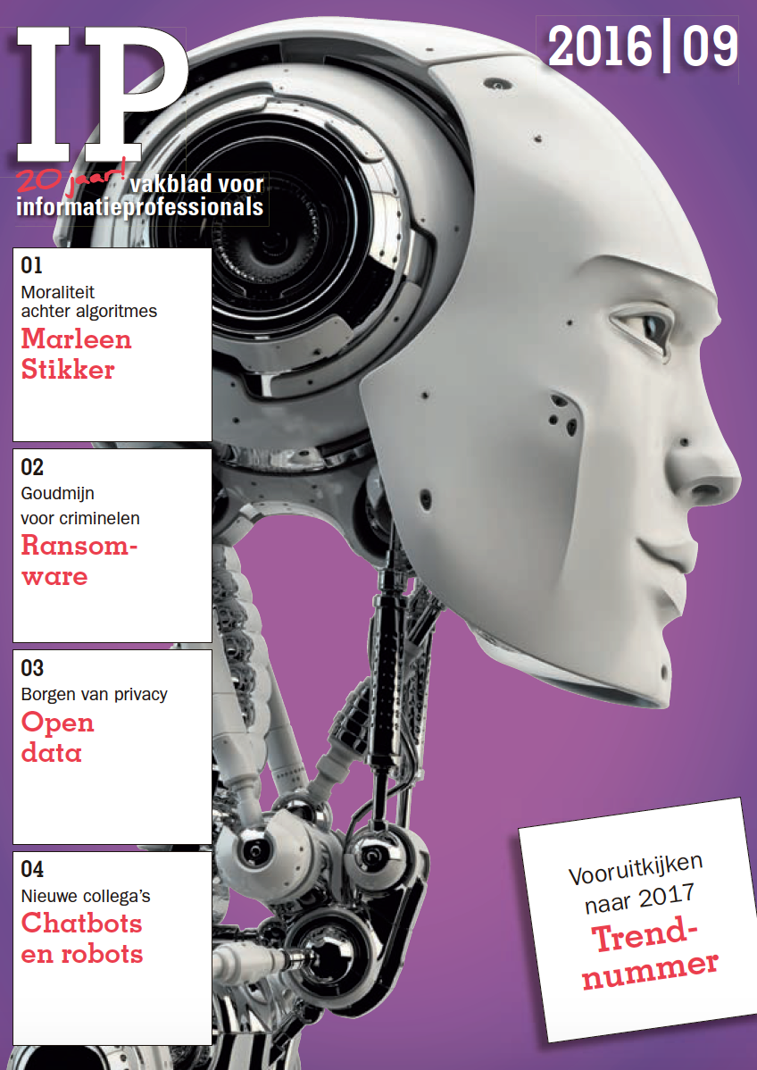 IP’ers zullen hun gebruikers moeten tonen dat zij in werk en privé meer bereiken met de waarheid en werkelijkheid aan hun zijde. Betekent dit IP’ers harder zullen moeten werken? Dat staat nog te bezien. De redactie stelt u in deze IP voor aan uw nieuwe collega’s Zora de robot en Stella de chatbot. Ze gaan u werk uit handen nemen zodat u uw kennis en kunde op een hoger niveau kunt inzetten. Bovendien krijgt u ook nog eens assistentie van zelflerende computersystemen. Binnen de broodnodige beperkingen ter bescherming van privacy belooft open data de gedigitaliseerde samenleving verder te helpen, betoogt directeur Melanie Peters van het Rathenau Instituut.