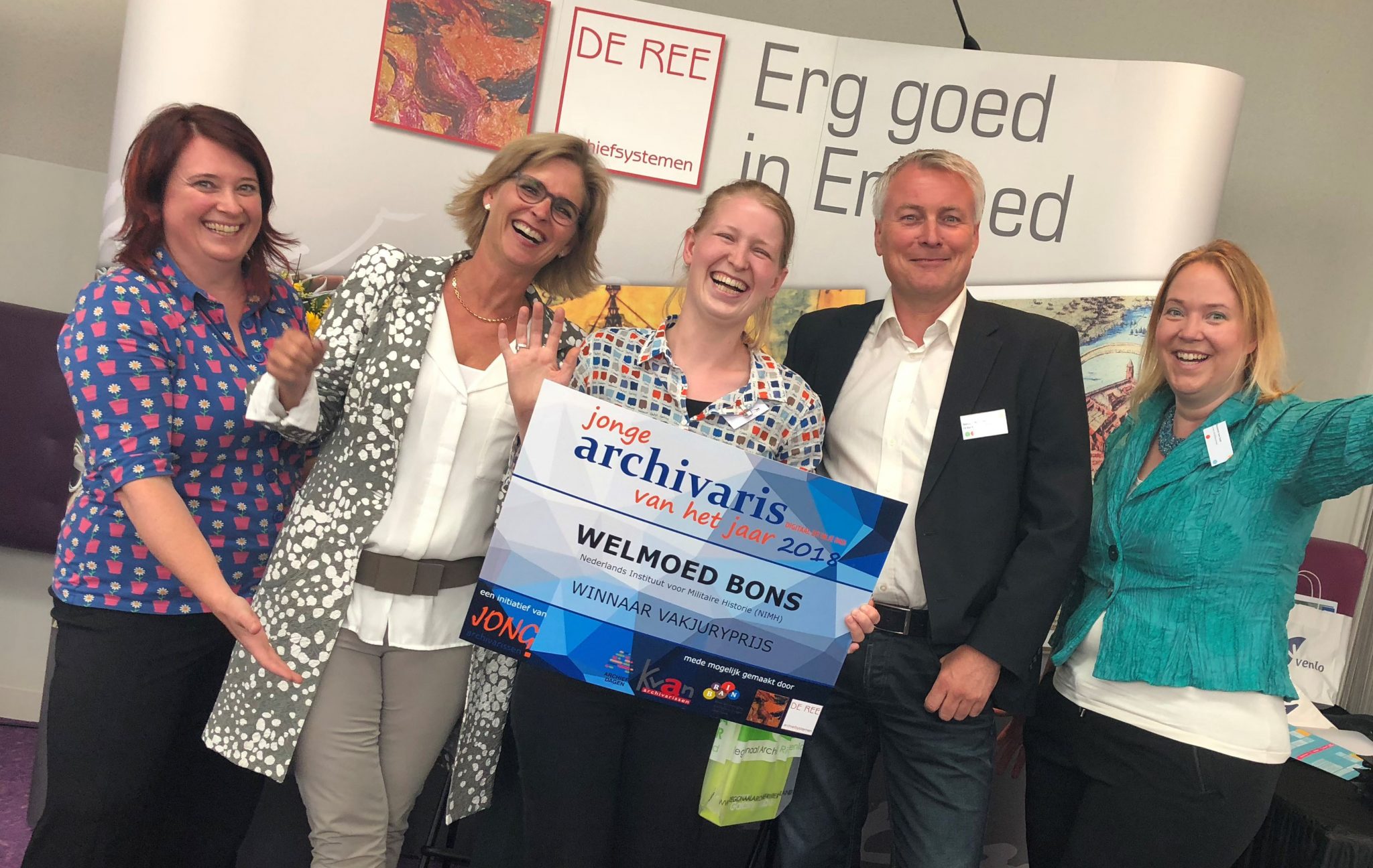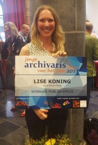 De verkiezing Jonge Archivaris van het Jaar 2018 wordt georganiseerd door JONG archivarissen om ‘startende archivarissen extra in de spotlights te zetten en zo aan te moedigen bij het realiseren van hun plannen’. Dit jaar was het thema ‘Digitaal zit in je DNA’. De genomineerden waren Evelien de Jonge, Lise Koning, Welmoed Bons, Jasper Snoeren, Ingeborg Huijberts.