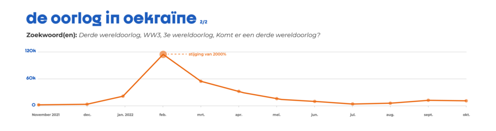 In februari wordt er volgens cijfers van Google bijvoorbeeld 33.000 keer gezocht op dienstplicht, een stijging van meer dan 800% in vergelijking met de maand ervoor. Zoekopdrachten zoals ‘derde wereldoorlog’ of ‘ww3’ zijn in februari goed voor een zoekvolume van 113.900, een stijging van meer dan 2000% ten opzichte van december 2021. Verder worden door de oorlog bepaalde producten schaars waardoor er een run op ontstaat. In maart zoekt men bijvoorbeeld 300.000 keer op zonnebloemolie, ruim 3600% vaker dan in de maand ervoor.