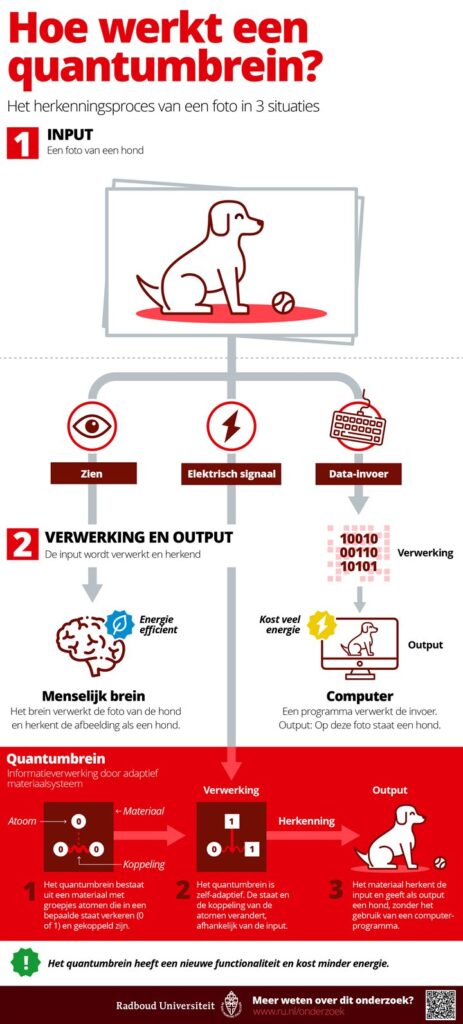 Een intelligent materiaal dat leert door zichzelf fysiek te veranderen, net zoals het menselijk brein, kan de basis vormen van een compleet nieuwe generatie energiezuinige computers. Natuurkundigen van de Radboud Universiteit werken aan zo’n zogenaamd ‘quantumbrein’ en hebben nu een belangrijke stap gezet. Ze kunnen een netwerk van atomen bouwen met vergelijkbaar gedrag als neuronen en synapsen in het brein. Ze publiceerden hun bevindingen onlangs in Nature Nanotechnology.