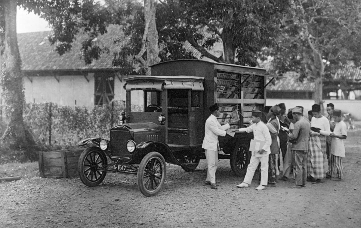 De ‘reizende bibliotheek’ was een onderdeel van Balai Poestaka, het Nederlands-koloniaal initiatief om de Indonesiërs aan ‘goede’ boeken te helpen. De foto laat zien hoe drukwerk destijds werd verspreid en hoe het boek ook op plaatsen kwam waar geen boekwinkels waren. (Foto vermoedelijk jaren dertig van de vorige eeuw, fotograaf onbekend).
